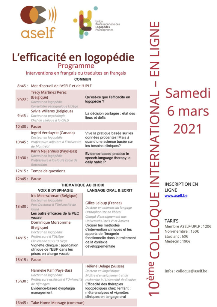 RÉSERVER ET PAYER Lieu ONLINE (les participants recevront le lien de connexion quelques jours avant le colloque) Tarifs Membre ASELF-UPLF : 120€ Non-membre : 150€ Etudiant: 60€ Médecin : 190€ Programme : ICI (Certaines conférences seront traduites en direct) Pour tout renseignement supplémentaire, contactez-nous : colloque@aself.be