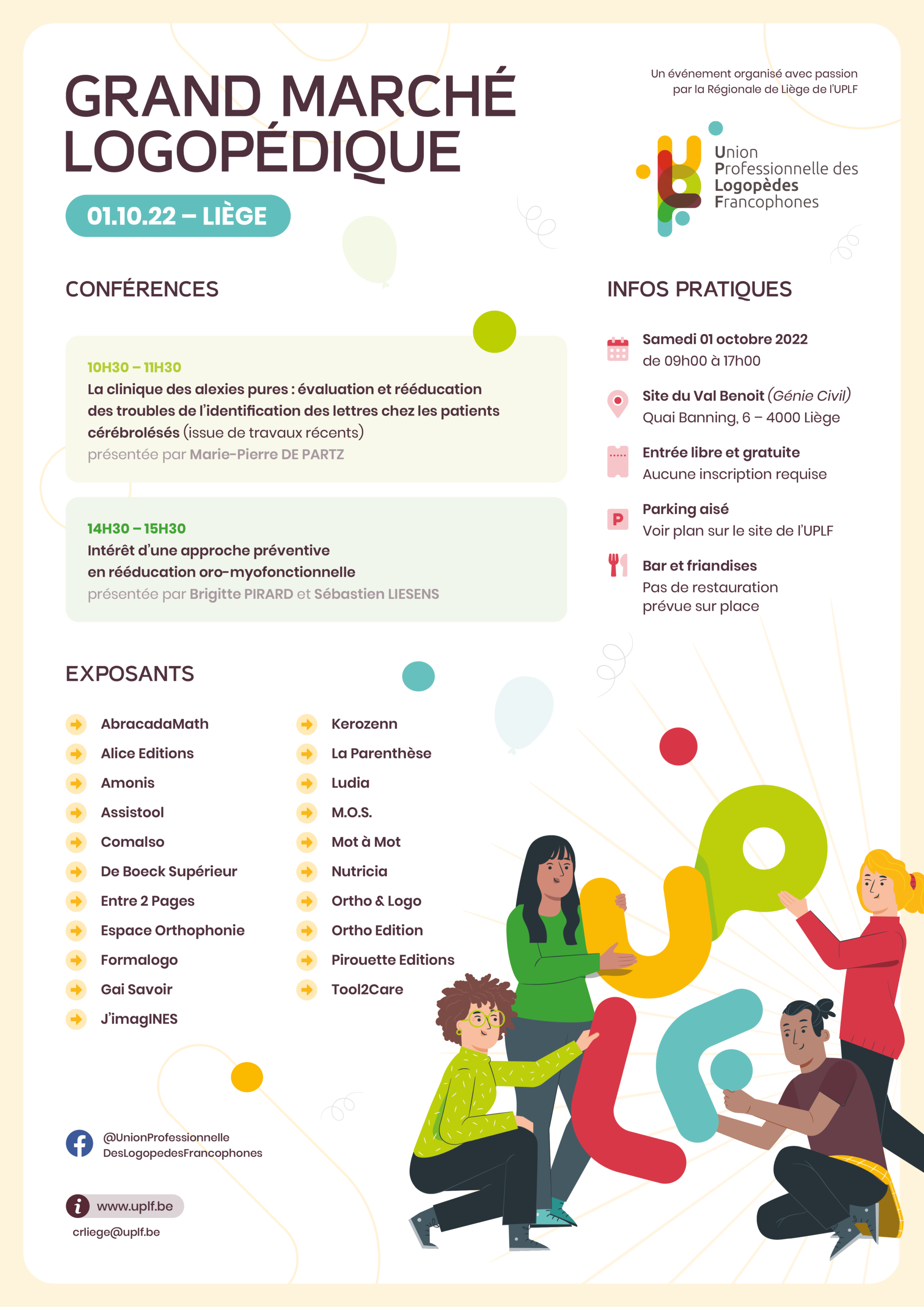 La Régionale de Liège de l’UPLF a été heureuse de vous accueillir cette année au sein de sa Cité Ardente pour participer au Grand Marché Logopédique le samedi 01 octobre 2022, de 09h00 à 17h00.