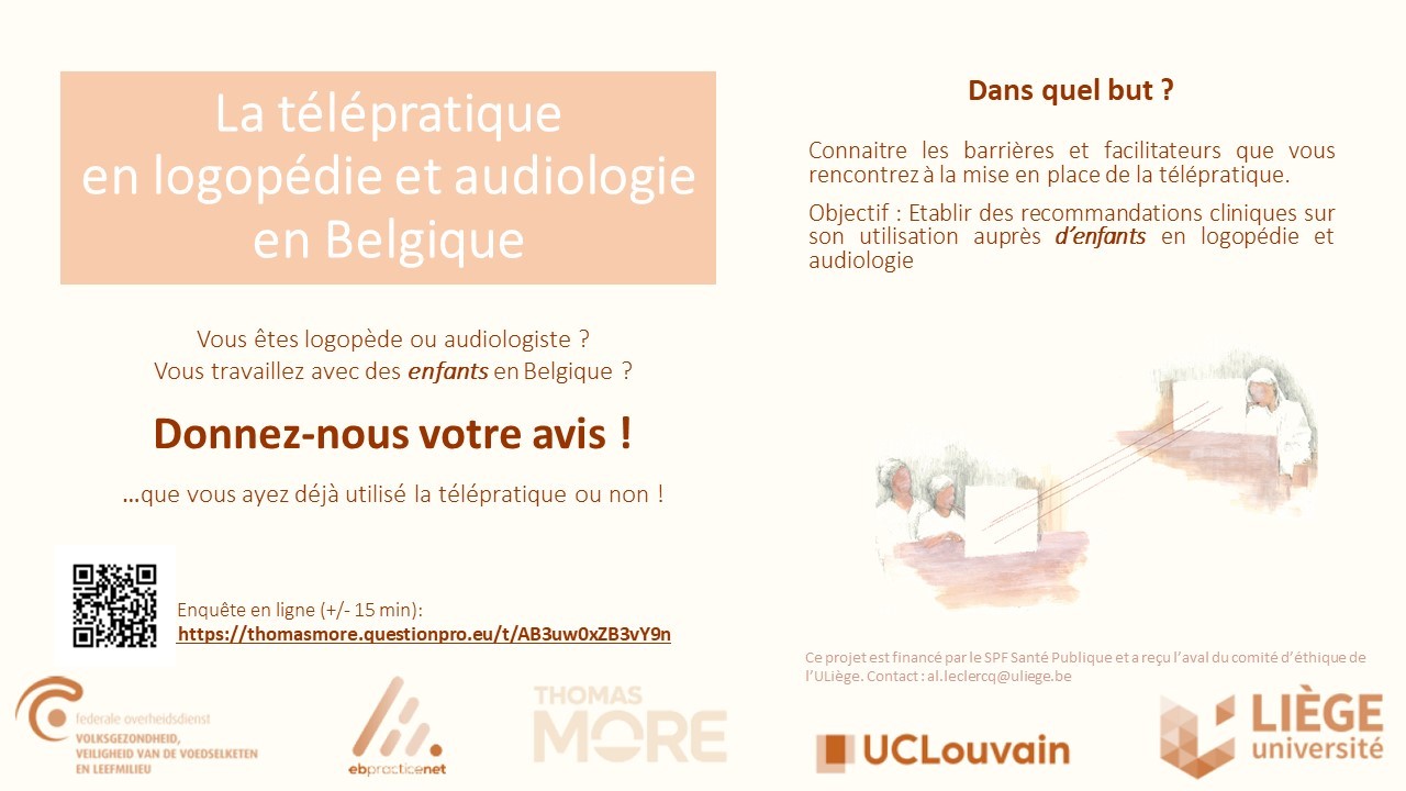 Nous sommes un groupe de chercheuses audiologistes et logopèdes, francophones et flamandes, mandatées par le SPF santé publique afin d’établir des recommandations de pratique clinique pour l’utilisation de la télépratique en logopédie et audiologie auprès d’enfants jusqu’à 12 ans.